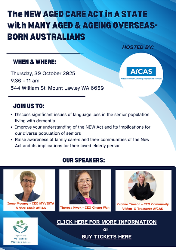"Via its network of contacts in different sectors, including the University and NAATI on how to provide CaLD-appropriate services, AfCAS would assist the aged care and disability provider with a holistic support."